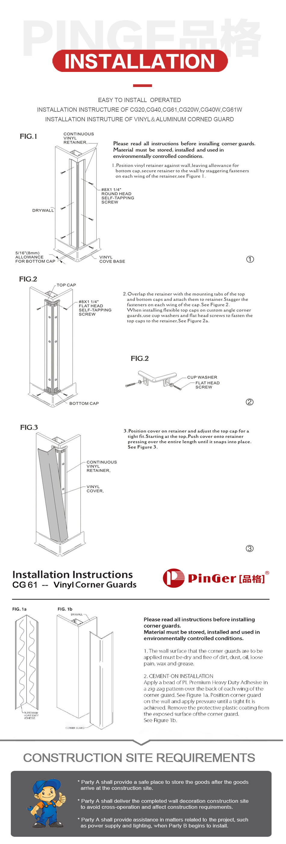 Protetores de canto montados com capa de vinil de 2 mm, retentor de alumínio de 2,0 mm ou retentor de vinil de 2,0 mm. Tampa de extremidade de ABS.